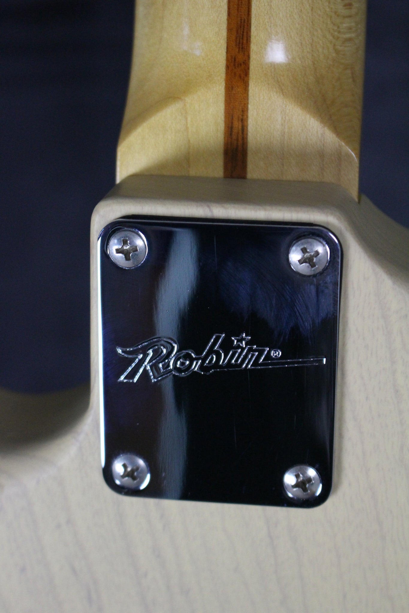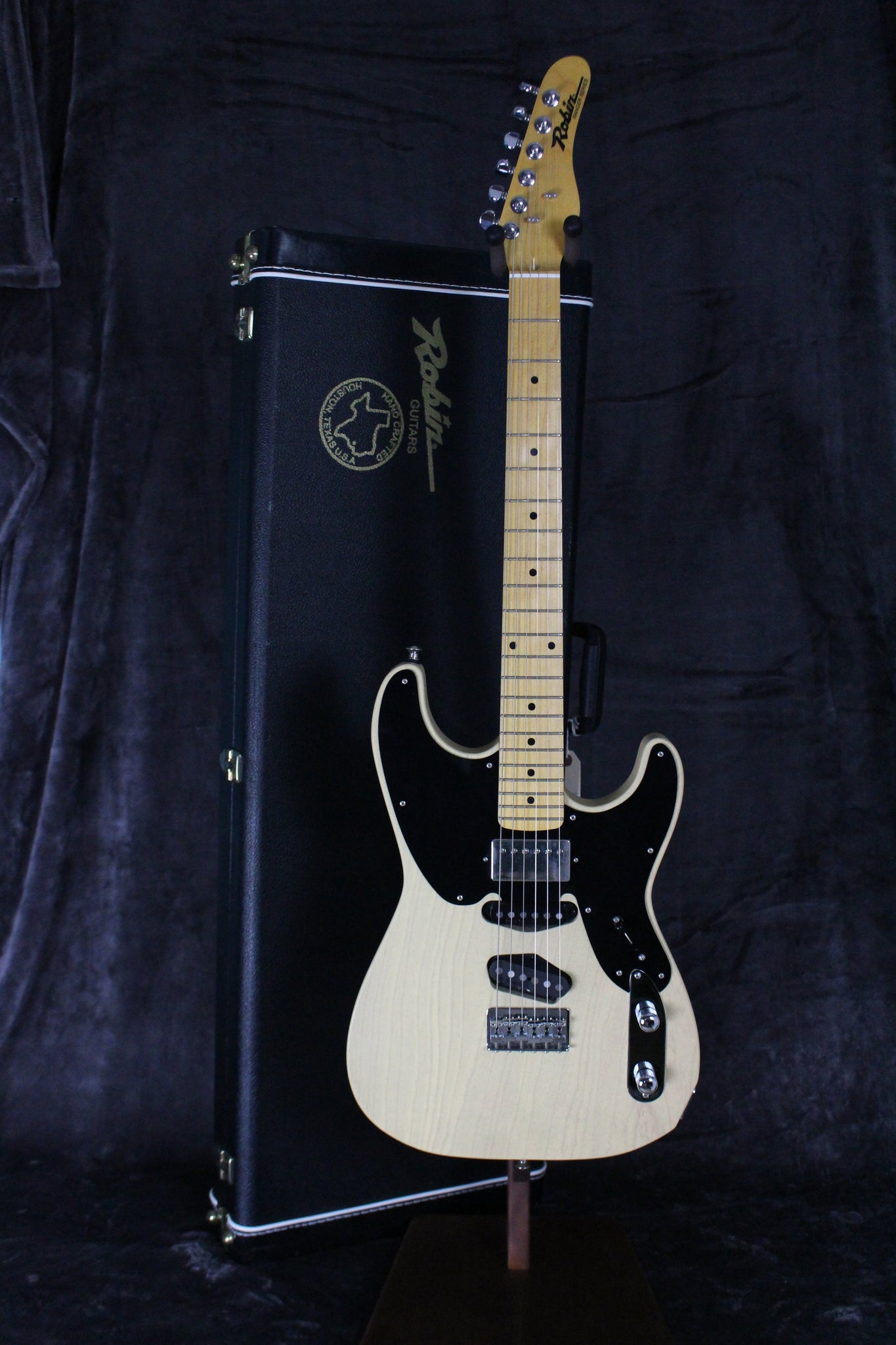 Up for sale is a rare and exceptionally crafted 2004 Robin Ranger HSS electric guitar in a gorgeous Old Blonde finish. Built in the USA by the now-discontinued Robin Guitars of Texas, this Ranger is a top-tier instrument that blends vintage-inspired style with modern playability and boutique-quality components. This model features a lightweight, resonant ash body with a thin, satin Old Blonde finish that allows the natural wood grain to subtly show through—offering both visual warmth and a tone-enhancing aged character. The neck is a solid one-piece maple design with a comfortable modern C profile, a smooth satin back, and a fast-playing maple fingerboard with medium jumbo frets – perfect for both expressive leads and solid rhythm work.