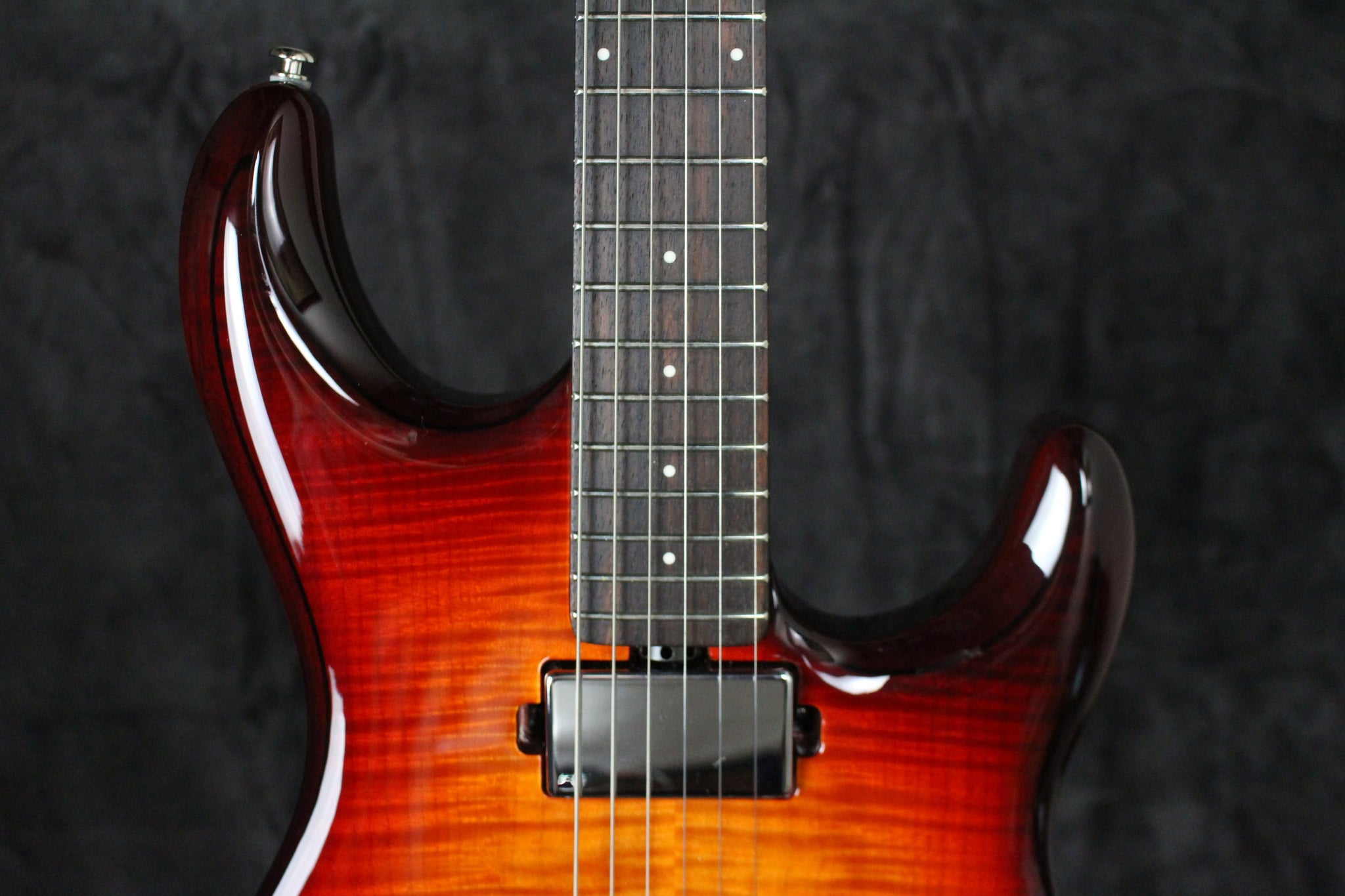 Neck: Roasted Flame Maple neck with a Rosewood fingerboard, 12” radius, 25.5” scale length, 1 5/8” nut width, 22 frets, White corian dot inlays.