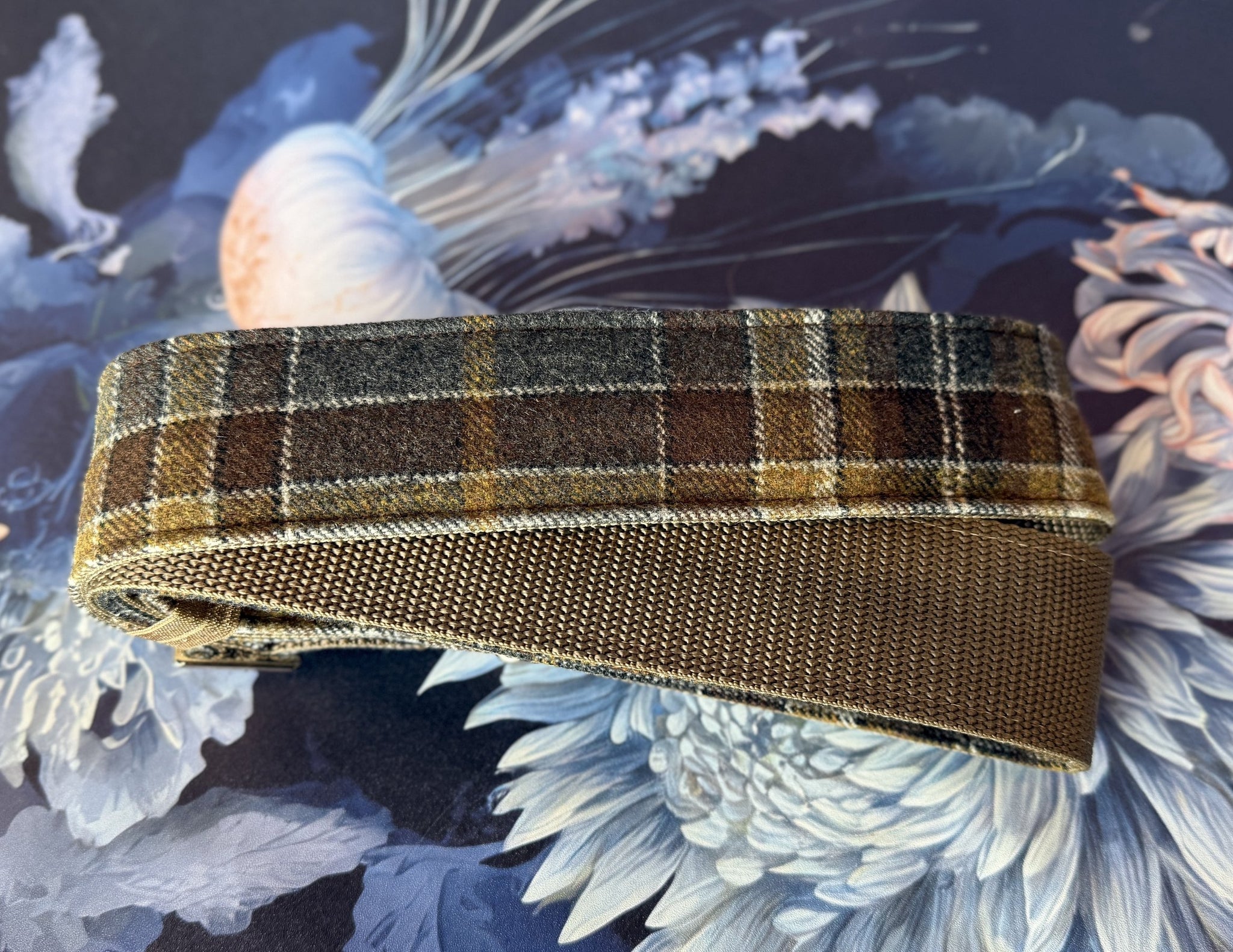 Ashes pairs a weathered plaid fabric with rich leather ends, blending grit and warmth in a way that feels lived-in from day one. The muted grays, browns, and mustard-toned lines echo old stages, late nights, and amps that have seen a little too much love.