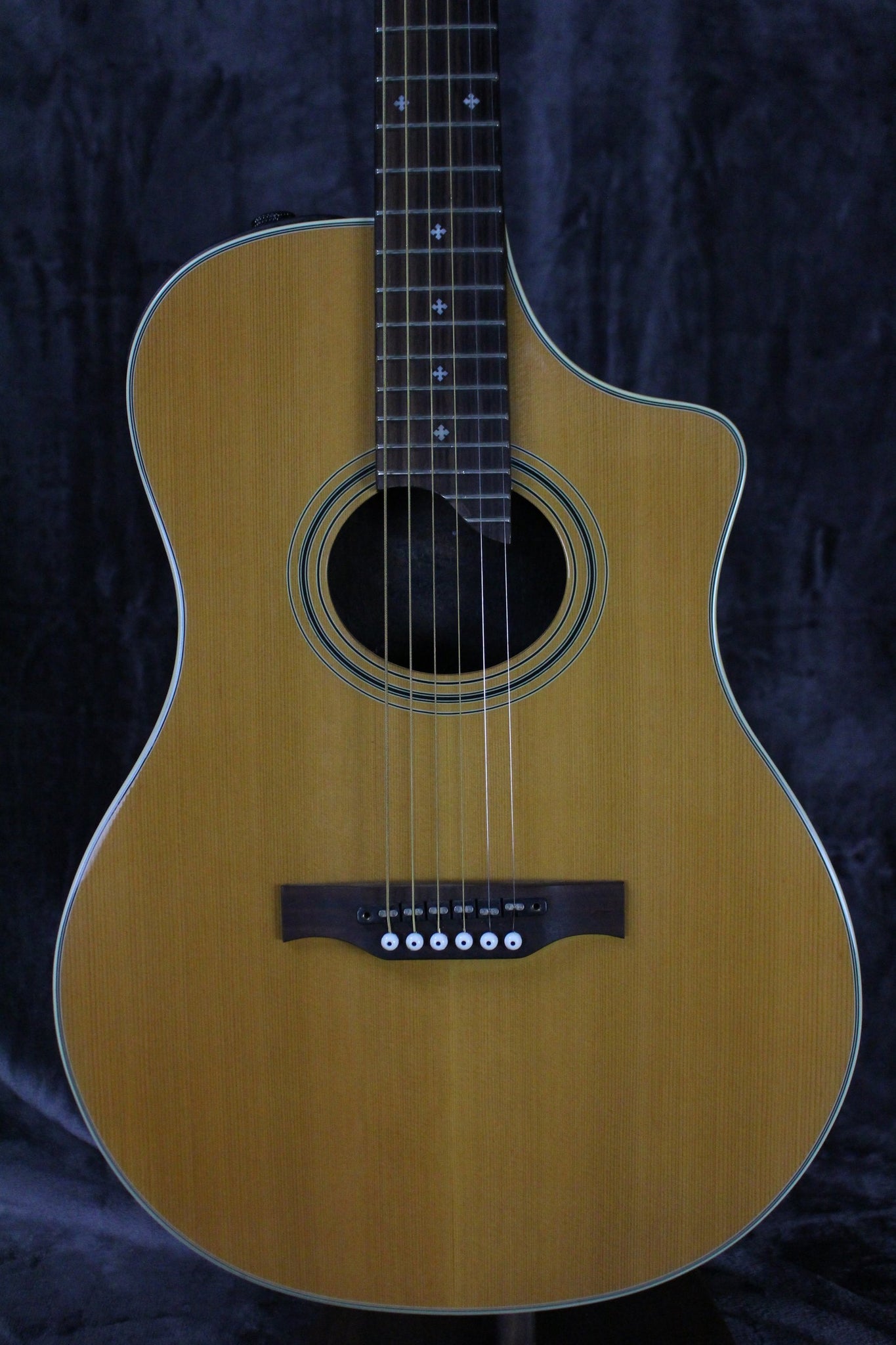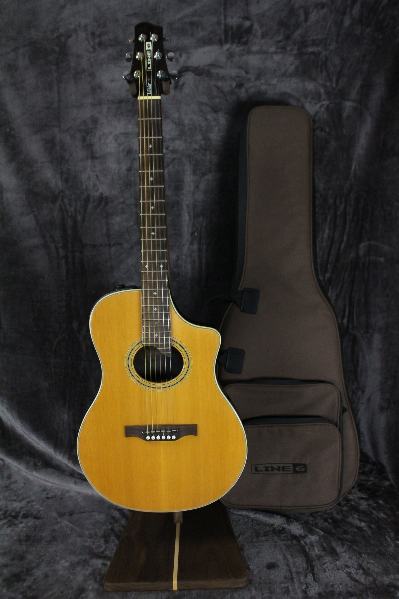 Pickups/Hardware: Under saddle pickup, closed gear tuners, pin bridge, 1 knob for selecting instrument simulation, 3 sliders for eq and volume. 1/4“ output, as well as Digital I/O jack for connecting to Line 6’s Vetta II, Ethernet Part is Untested.